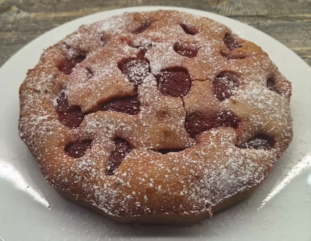 Готовый пирог достать из духовки и, пока он еще горячий, полить 1-2 столовыми ложками клубничного сиропа. Позволить пирогу немного остыть, после чего он будет легко нарезаться и прекрасно держать форму.