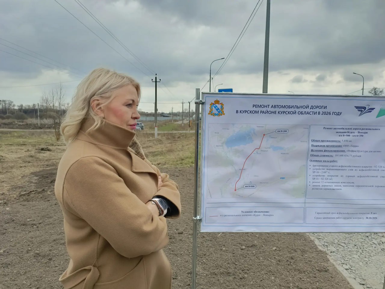 Заместитель губернатора Елена Атанова и министр транспорта Александр Замараев дали старт дорожному сезону в Курском районе. Они осмотрели участок трассы «Курск–Поныри» протяжённостью 5,8 км, который стал первым объектом ремонта в 2026 году.