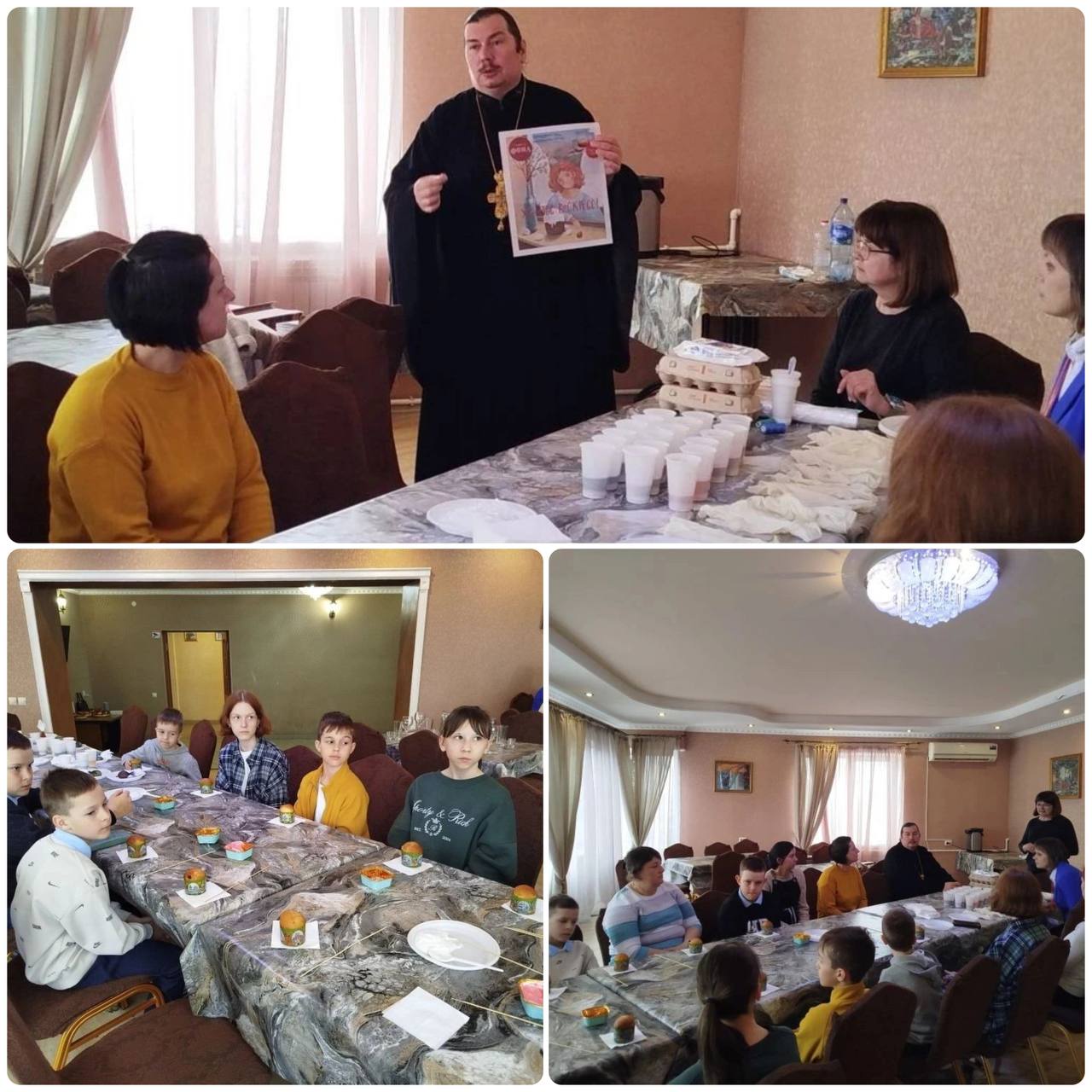 Особым гостем встречи стал руководитель миссионерского отдела Железногорской епархии иеромонах Дамиан. Батюшка стал не просто гостем, а духовным наставником этого дня: рассказал о светлой истории праздника, напомнил о глубоком смысле пасхальных обычаев и с теплотой выслушал истории ребят о том, как в их семьях из поколения в поколение берегут традицию украшения яиц.
