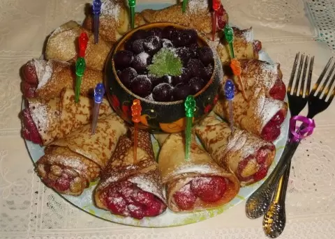 Каждый блинчик рулетиком наполняется ягодами, которые затягиваются шпажкой, создавая запоминающееся лакомство. В результате получаются вкусные блинные рулеты, которые напомнят о теплом лете.