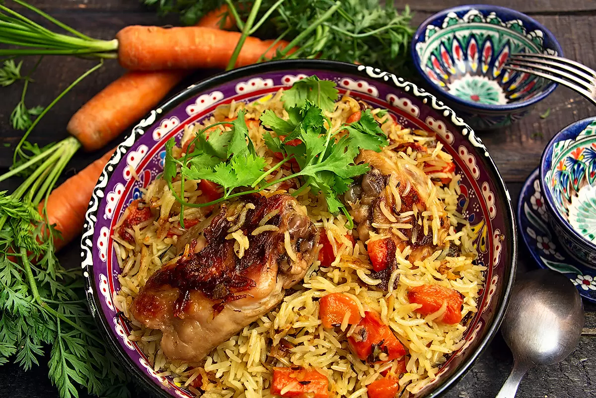 - Рис: Одна из главных особенностей — это рассыпчатый рис, который не бывает перенасыщенным жидкостью. Обычно его готовят в ароматном мясном бульоне, например, курином или бараньем.