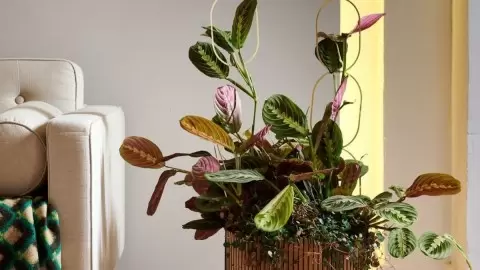 Для любителей узоров и цвета подходят растения с окрашенной листвой. Кротон словно палитра осенних оттенков: желтый, алый, бордовый и зелёный соседствуют на одном кусте. Маранта, строманта и калатея поражают узором листа: витиеватые линии, геометрия и напоминающие перья рисунки. Неплохо дополнит композицию и традесканция зебрина — полосатые побеги и компактная форма позволяют разместить её на полке или в подвесном кашпо.