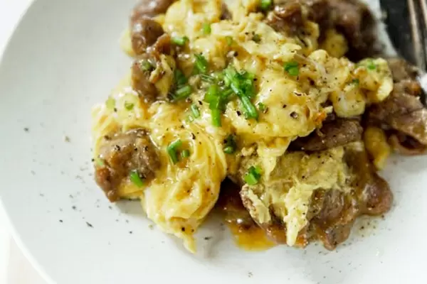В мире кулинарии есть две неподвластные времени проблемы: жесткая говядина и сухие яйца. Тем не менее, в этом китайском стир-фрае они удачно находят общий язык — благодаря тому, что яйца превращаются не просто в омлет, а в мягкую шелковистую оболочку, которая аккуратно готовит мясо до идеальной нежности.