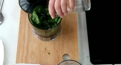 Для начала необходимо приготовить тесто для блинчиков с красной рыбой. Сначала шпинат, свежий или замороженный, следует поместить в блендер, добавить воду и довести до однородного состояния.