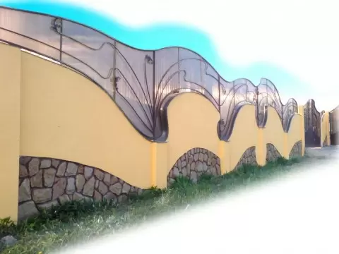 Не менее интересен забор из металлического каркаса с поликарбонатовыми вставками. Такая конструкция отличается не только защитными качествами, но и стильным визуальным оформлением. Металлические столбики, дополненные деревянными элементами, также станут оригинальным решением для вашего участка.