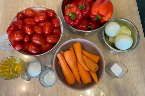 Все овощи помещаются в большую кастрюлю, тщательно перемешиваются и ставятся на медленный огонь. С момента закипания их нужно готовить 45 минут.