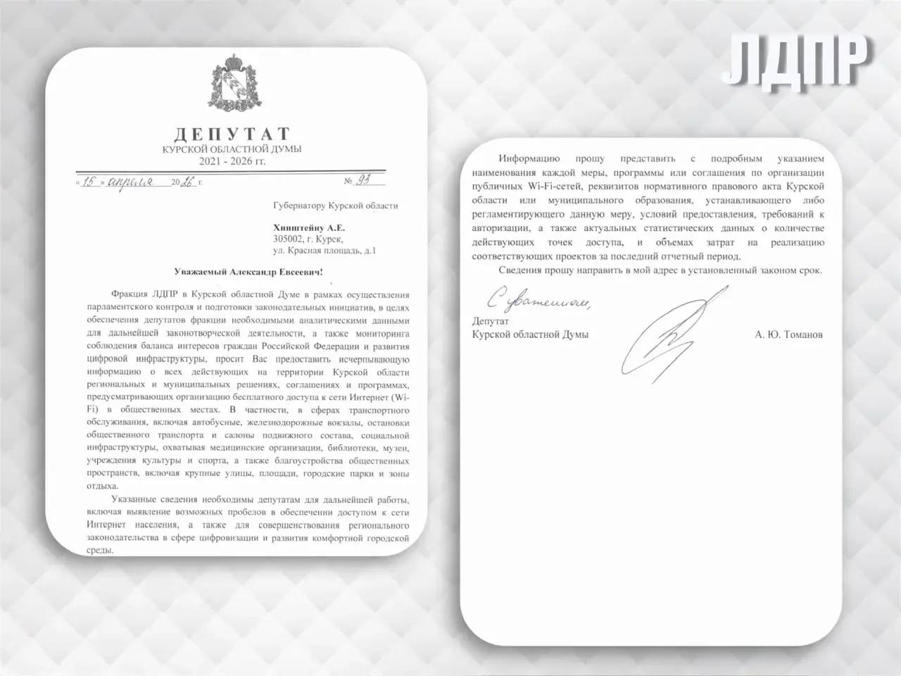 Депутат Алексей Томанов запросил у губернатора Курской области полный список всех бесплатных точек доступа — в автобусах, поликлиниках, парках и на вокзалах.
