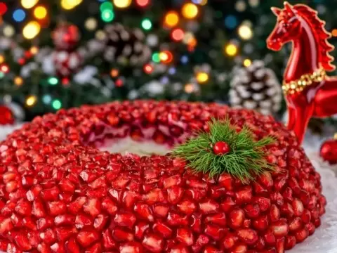 Декорирование: Очистите гранат и плотно разложите его зерна по поверхности салата. В году Красной Лошади важно, чтобы салат выглядел ярко, не жалейте граната. Аккуратно удалите стакан, прокручивая его.
