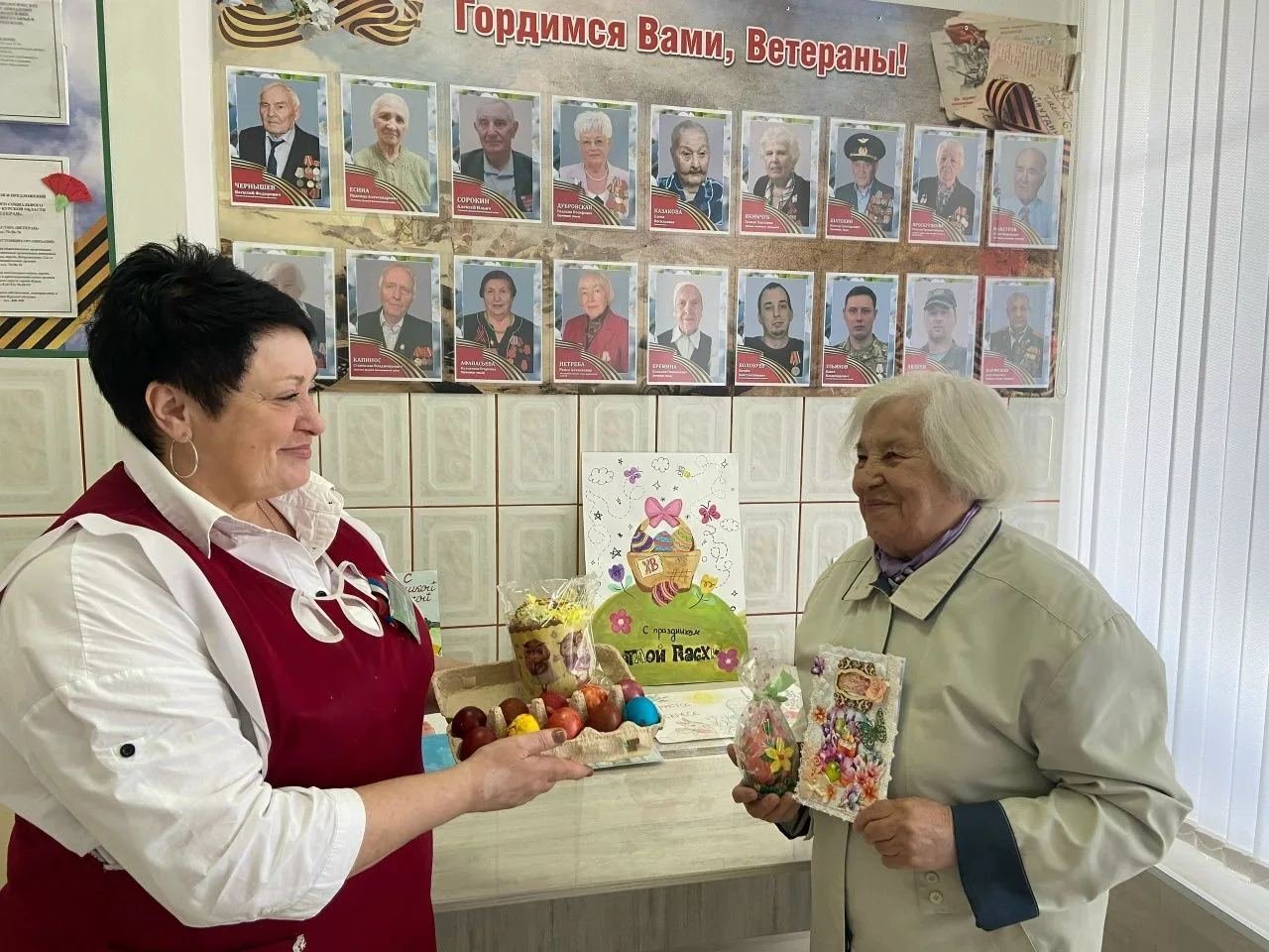 Всю Светлую Седмицу сотрудники учреждения "Ветеран" продолжали поздравлять получателей социальных услуг, вручая сладкие подарки и поздравительные открытки.