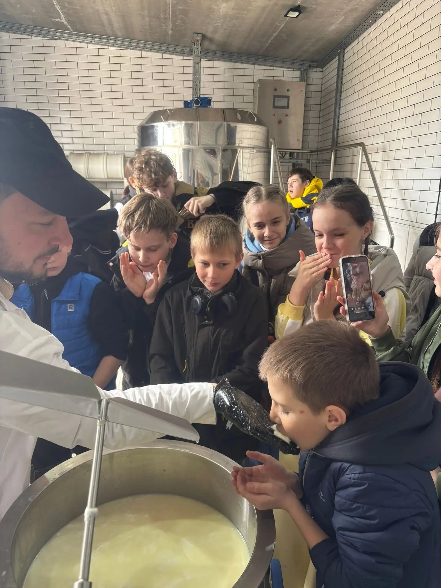 Ребятам показали домашних животных, они покормили телят. Одна из запомнившихся деталей поездки – поездка на синем тракторе. Школьники познакомились с процессом приготовления сыра и даже сами приняли участие в его изготовлении. Завершилось всё дегустацией готовой продукции.