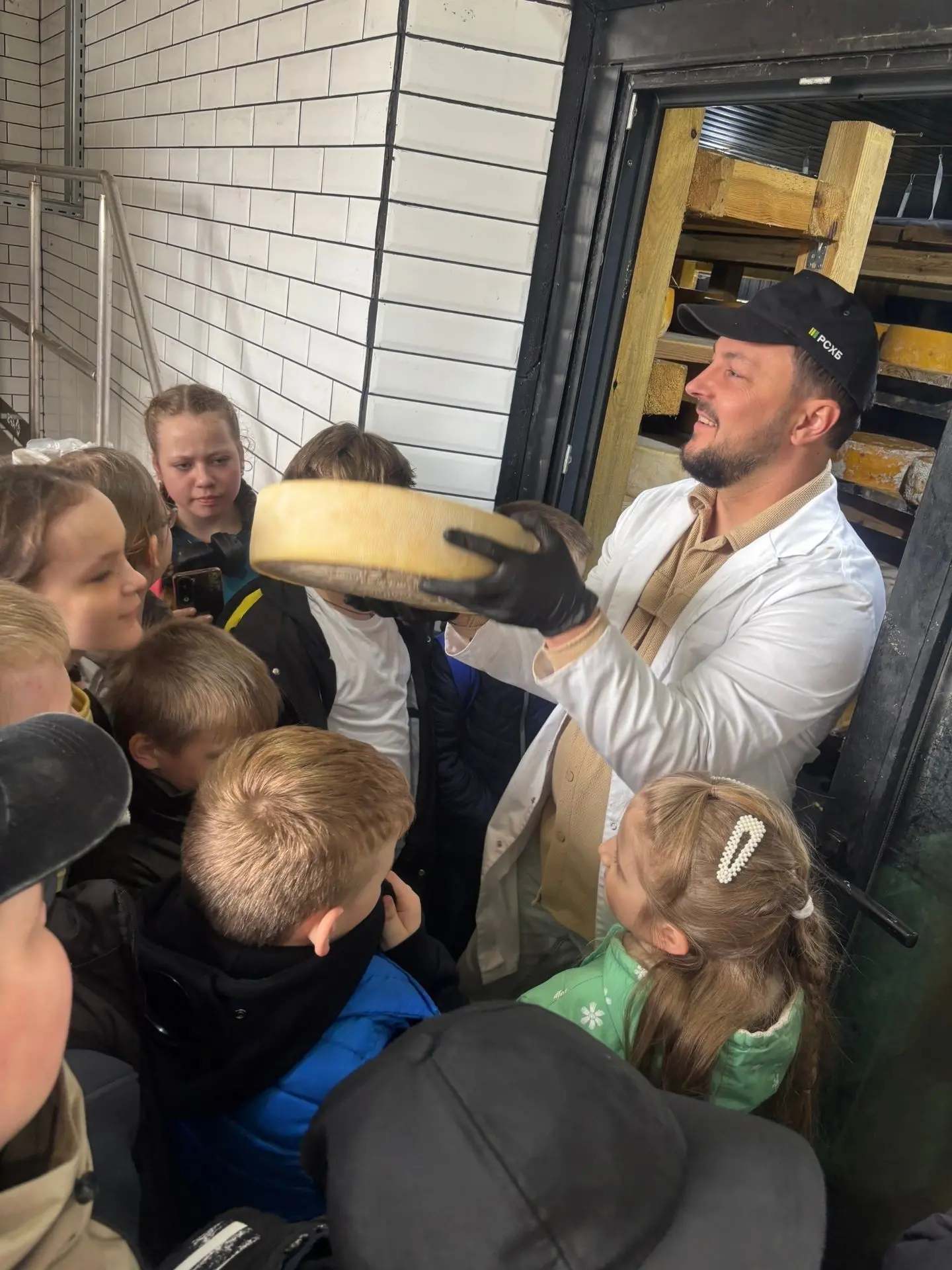 В рамках акции «Моя профессия – моё будущее» пятиклассники вместе с классным руководителем Еленой Сергеевой посетили фермерский проект Александра Волкова. Это хозяйство известно своими авторскими сырами «Малевич» и «Щепкин».
