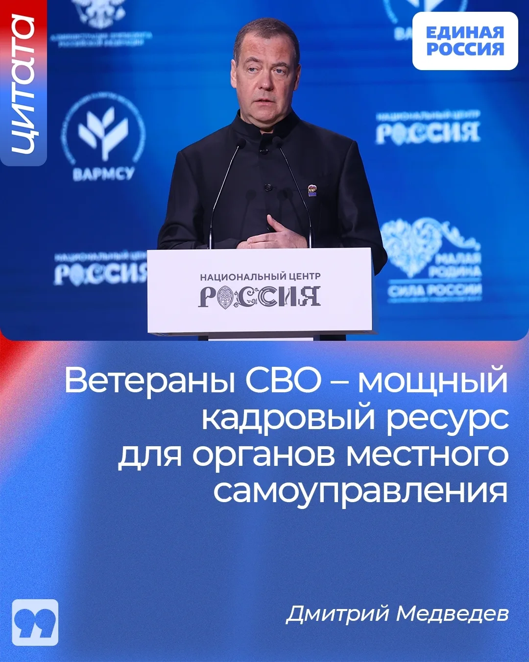 Ветераны специальной военной операции это кадровый ресурс для органов местного самоуправления . Об этом заявил Дмитрий Медведев на Всероссийском муниципальном форуме «Малая Родина – Сила России».