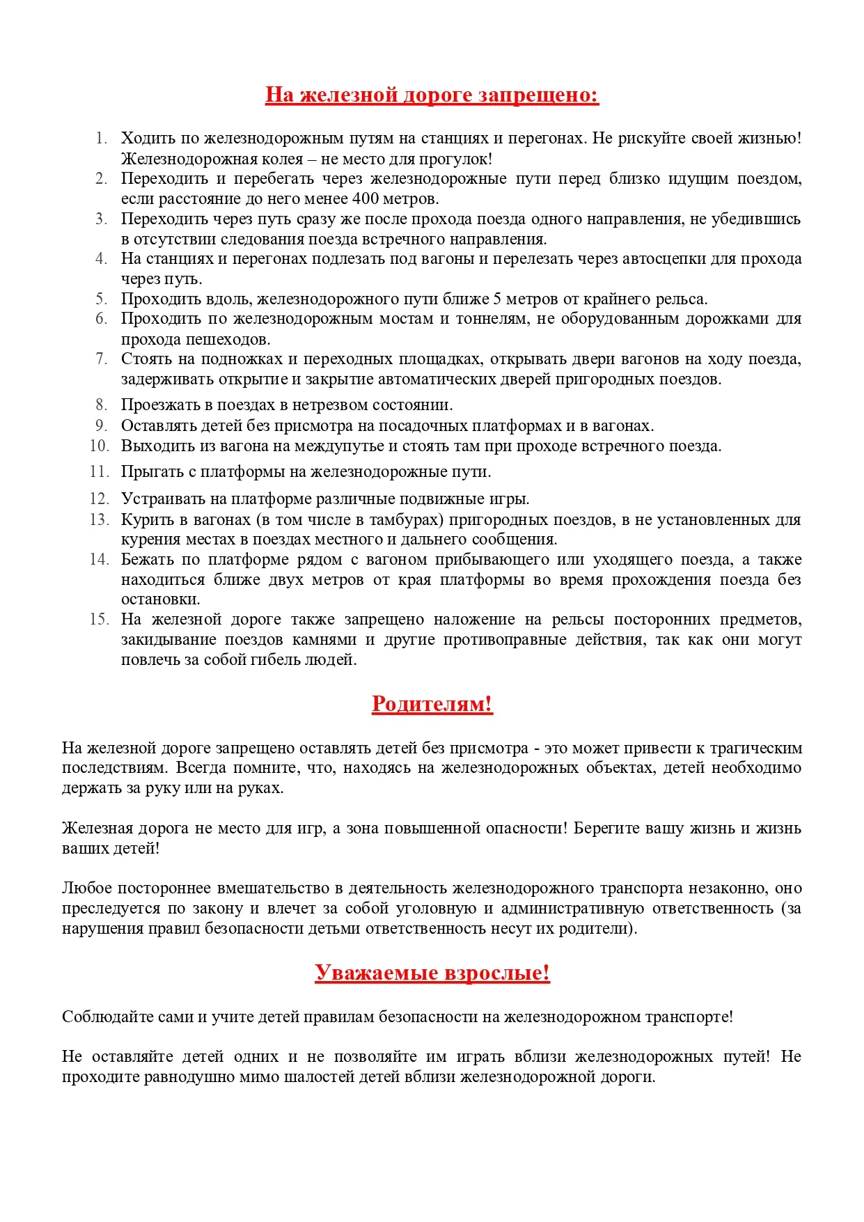 Железная дорога – это зона повышенной опасности, где главным травмирующим фактором был и остается наезд подвижного состава, высокое напряжение в контактном проводе. Отсюда следует, что нахождение детей в зоне железной дороги может быть смертельно опасно. Однако, пренебрегая существующим запретом, некоторые ребята самостоятельно находятся на железнодорожных путях, цепляются за автосцепки и подножки вагонов. Шалость не остается безнаказанной, дети получают травмы различной тяжести и, как правило, остаются инвалидами. Это происходит потому, что детям не объясняют, что игры на железнодорожных путях приводят к трагедии. Каждый гражданин, попавший на железную дорогу, должен помнить о своей безопасности и защитить себя или ребенка, помня основные правила нахождения на пути: