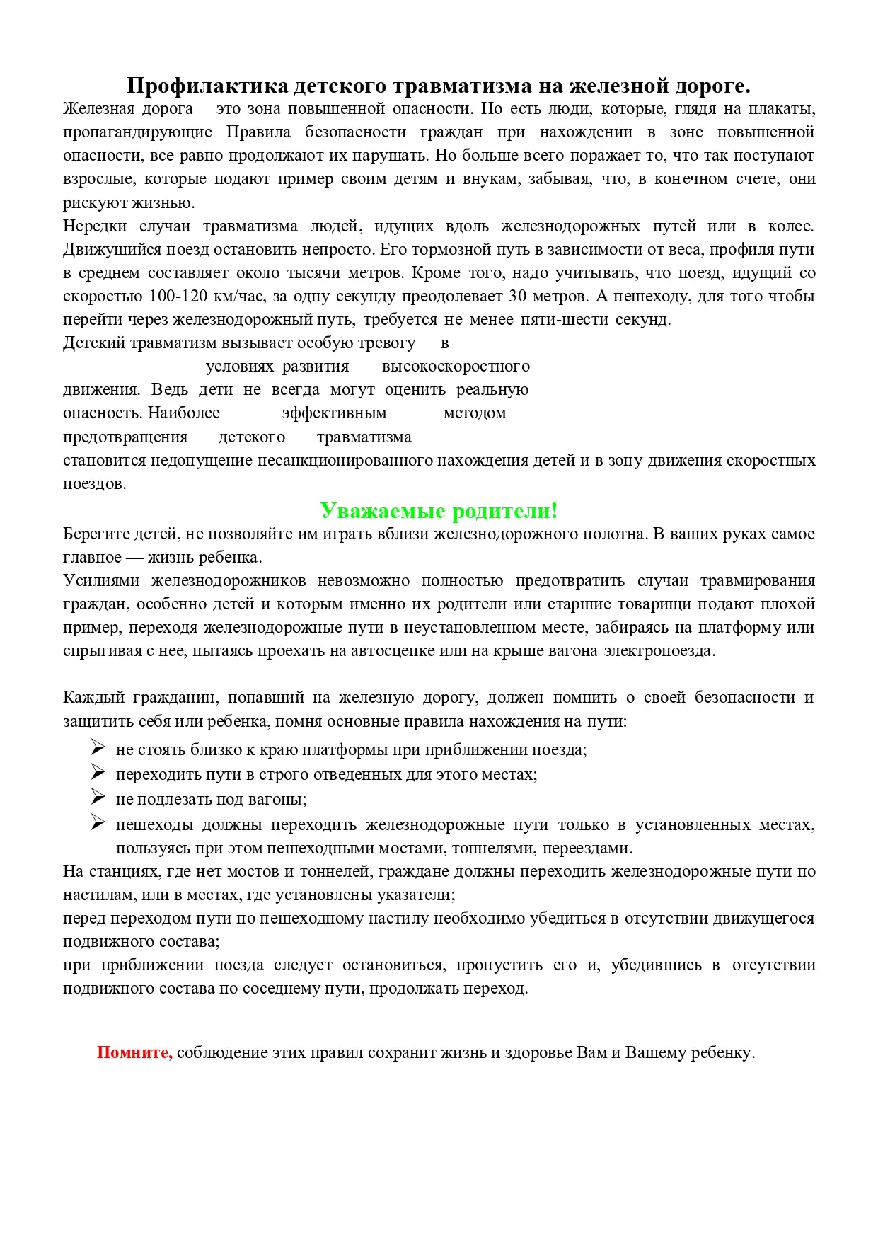 ПАМЯТКА «Профилактика детского травматизма на железнодорожном транспорте" ПОМНИТЕ, ЧТО ЖЕЛЕЗНАЯ ДОРОГА ЭТО НЕ МЕСТО ДЛЯ ИГР, А ЗОНА ПОВЫШЕННОЙ ОПАСНОСТИ, ГДЕ ЦЕНА НЕВНИМАТЕЛЬНОСТИ - ВАША ЖИЗНЬ И ЗДОРОВЬЕ
