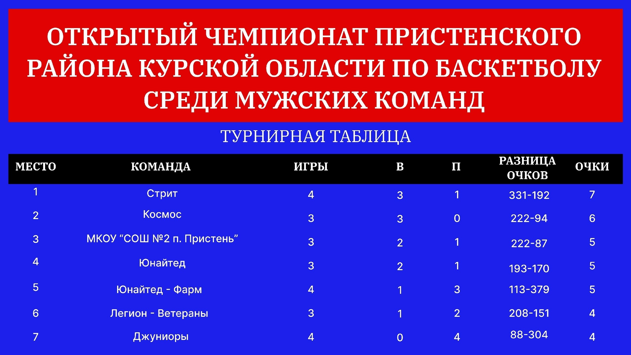 19 апреля на паркете прошли игры 4-го тура Открытого Чемпионата Пристенского района по баскетболу среди мужских команд. Зрители стали свидетелями захватывающих поединков и ярких моментов!