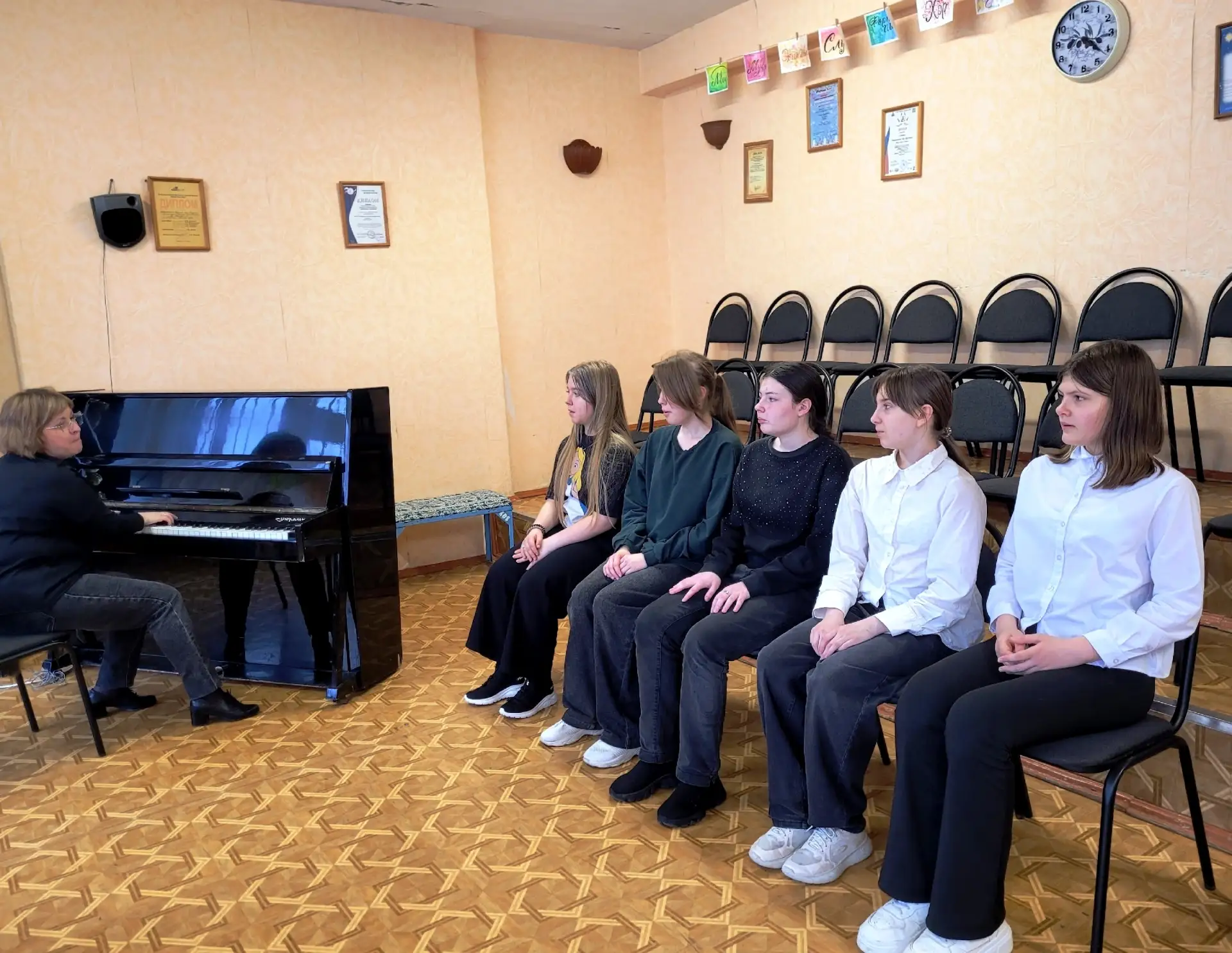 Занятие провела Ольга Алексеевна Королева — преподаватель хорового отделения высшей категории и заведующая инструментальным отделением ДШИ им. Г. В. Струве.