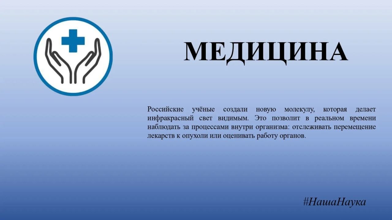 Исследования с помощью инфракрасного света станут эффективнее и доступнее. Российские учёные создали новую молекулу, которая делает такой свет видимым. Это позволит в реальном времени наблюдать за процессами внутри организма: отслеживать перемещение лекарств к опухоли или оценивать работу органов.