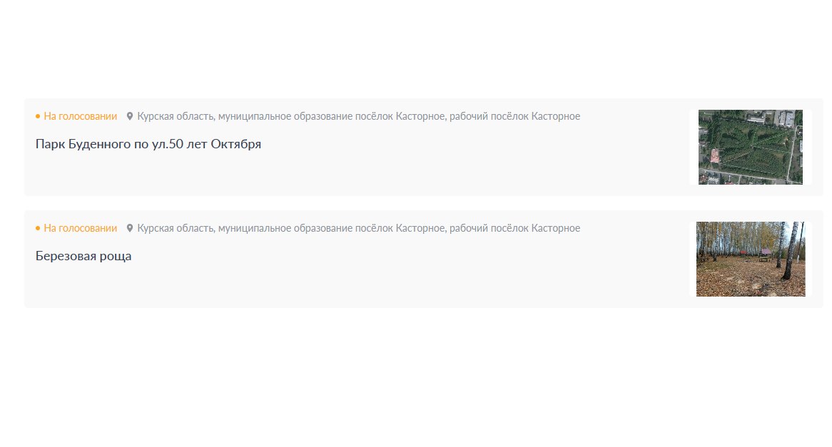 Отныне каждый житель страны получает возможность стать действующим лицом перемен. В Касторенском районе представлены для преобразования два пространства в п. Касторное: парк им. Буденного в п. Касторное и Березовая Роща.