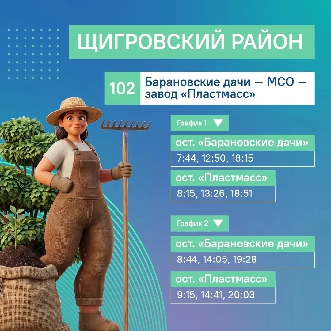 Завершаем совместную с Центром управления регионом серию публикаций карточек с расписанием дачных маршрутов. Сегодня — Курчатовский и Щигровский районы.