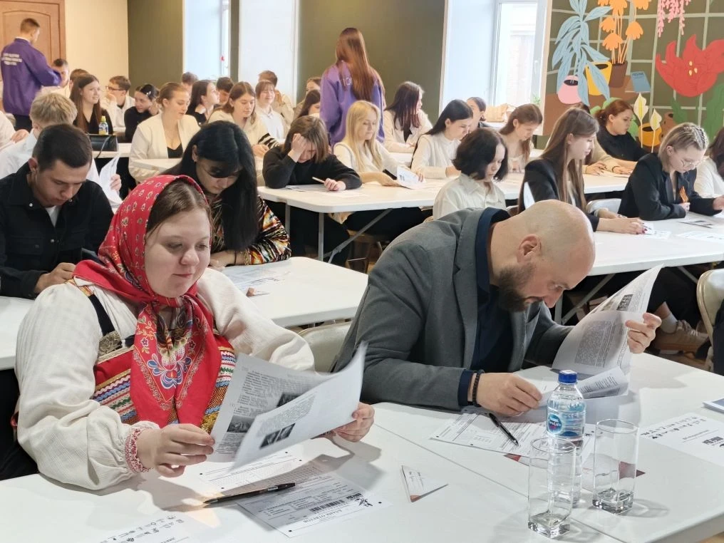 Площадкой стало креативное пространство «Веранда». Вместе с главой города историю вспомнили студенты педагогического колледжа и монтажного техникума – всего более 50 человек. Некоторые ребята пришли на диктант в национальных костюмах — это связано с тем, что 2026 год в России объявлен президентом Годом единства народов России.