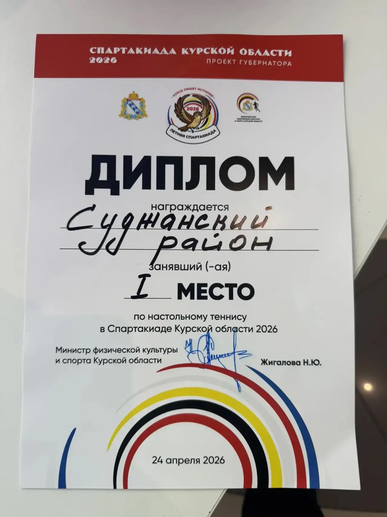 Сборная муниципалитета заняла 1-е место по настольному теннису в рамках Спартакиады Курской области 2026 года.