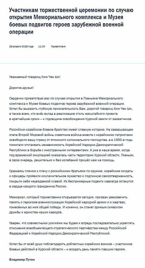 Владимир Путин направил приветствие участникам церемонии открытия Мемориального комплекса и Музея боевых подвигов героев зарубежной военной операции в Пхеньяне