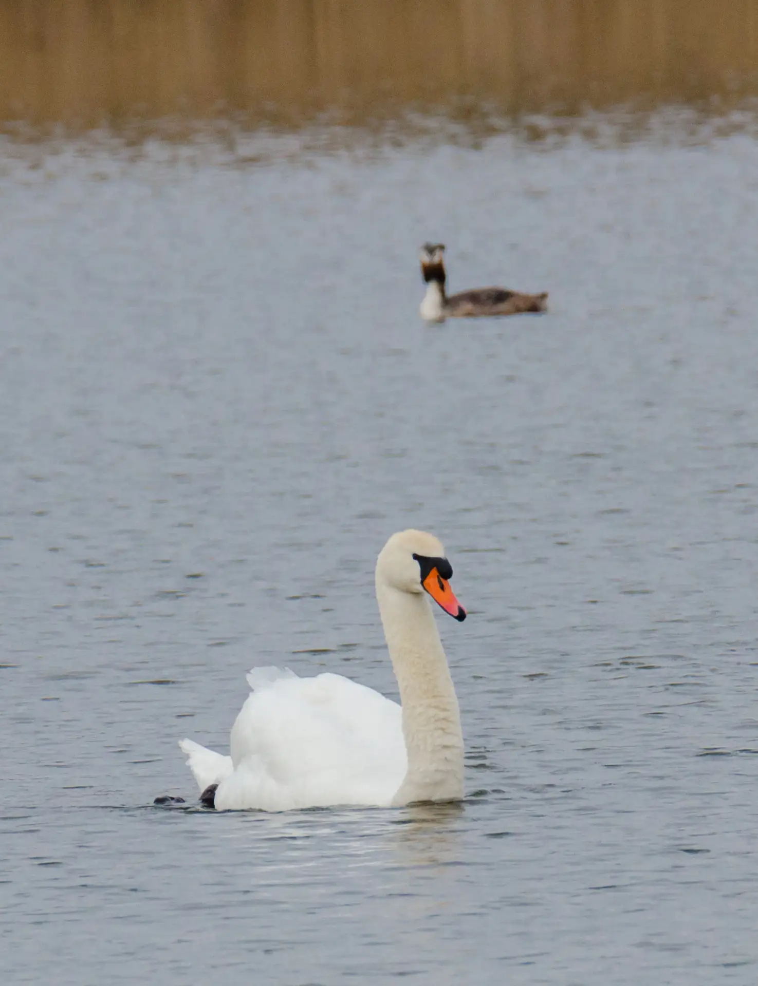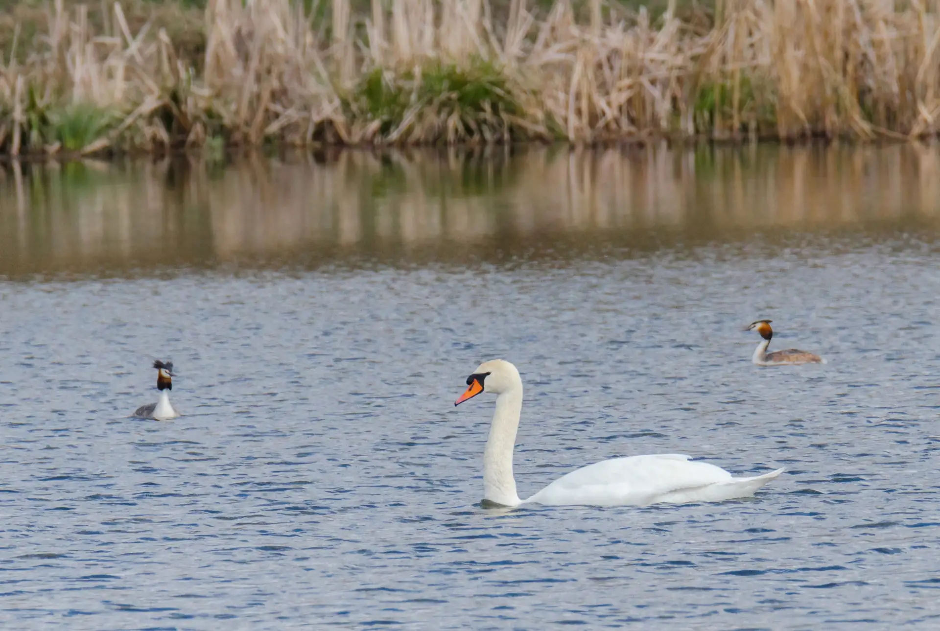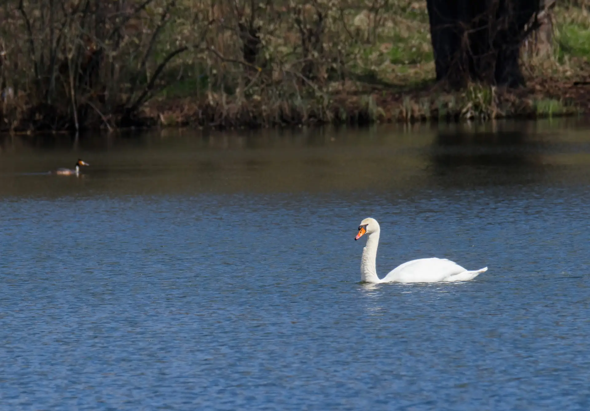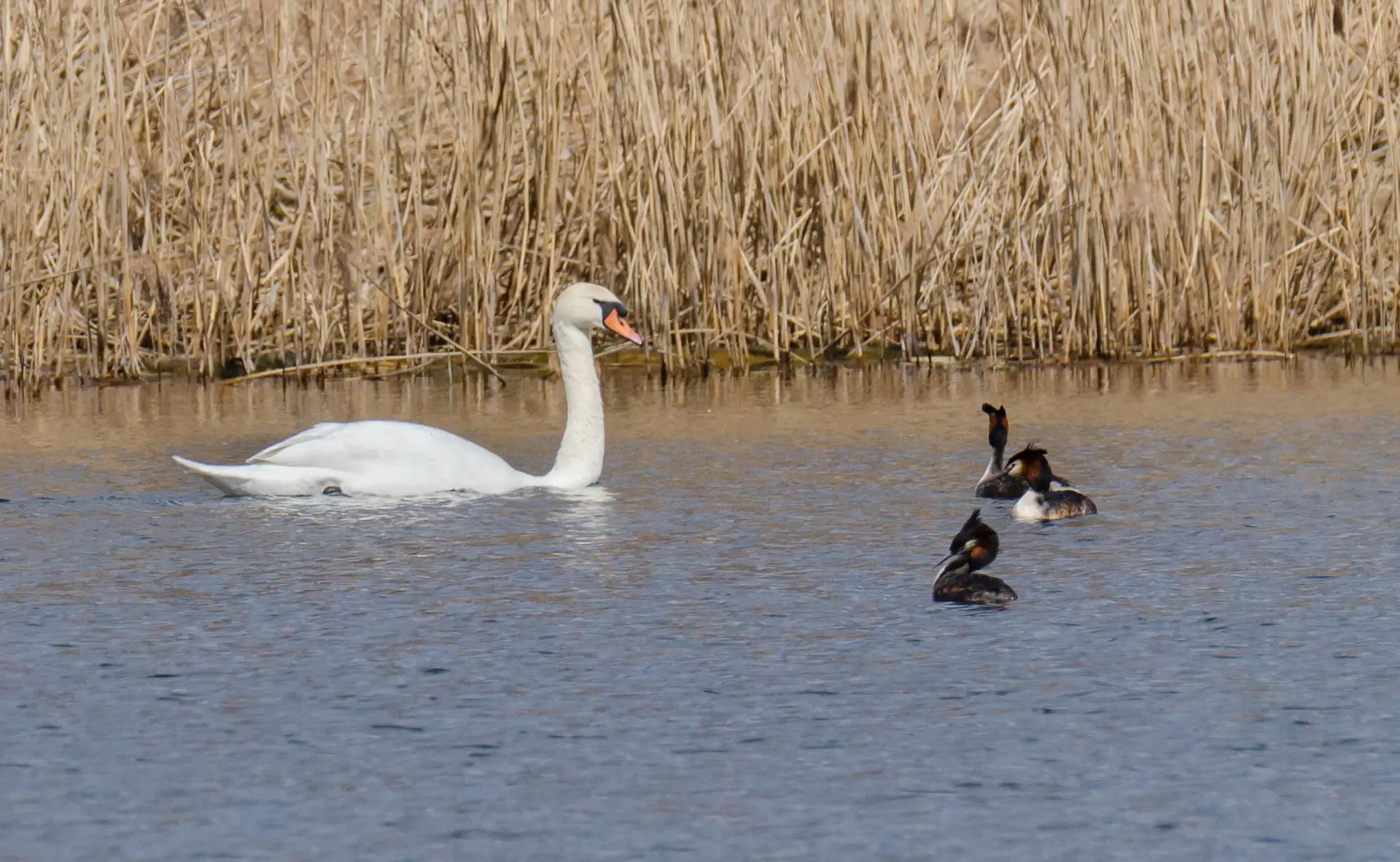 Лебеди и чомги на Черняковском водохранилище в Железногорске. Фото: Константин Ларин. #ПриродаСоловьиногоКрая