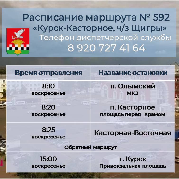 Информируем вас об изменениях в расписании движения по межмуниципальному маршруту № 592 "Касторное – Курск (Привокзальная площадь), через Щигры".