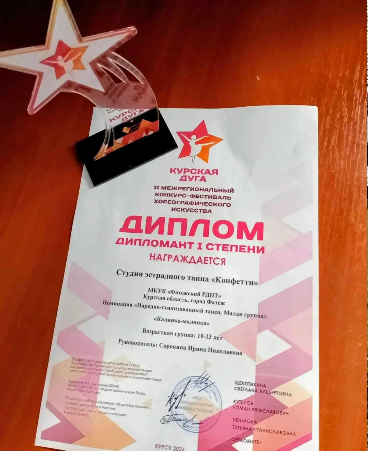 26 апреля состоялся II Межрегиональный конкурс-фестиваль хореографического искусства «Курская дуга» в Областном дворце культуры имени народного артиста РФ В.Н. Винокура. В этом мероприятии принял участие коллектив студии эстрадного танца «Конфетти» РДНТ, которые стали дипломантами I степени в категории малой группе с танцем «Калинка-малинка».