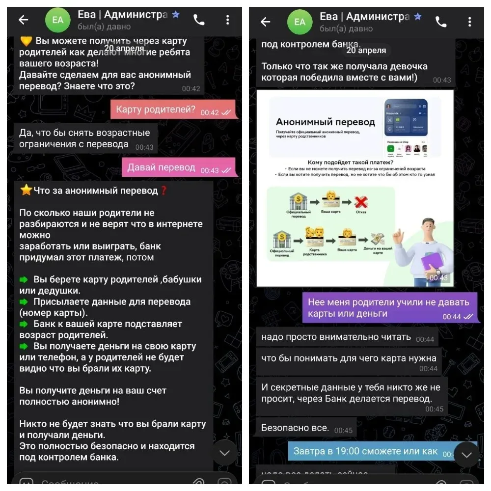Схема началась с «выигрыша» в мессенджере. Под предлогом получения приза злоумышленники втянули ребенка в переписку, запросили данные, а затем начали поэтапно управлять его действиями. Использовались фиктивные чеки, имитация банковских уведомлений, запугивание «штрафами» и обращением в полицию.