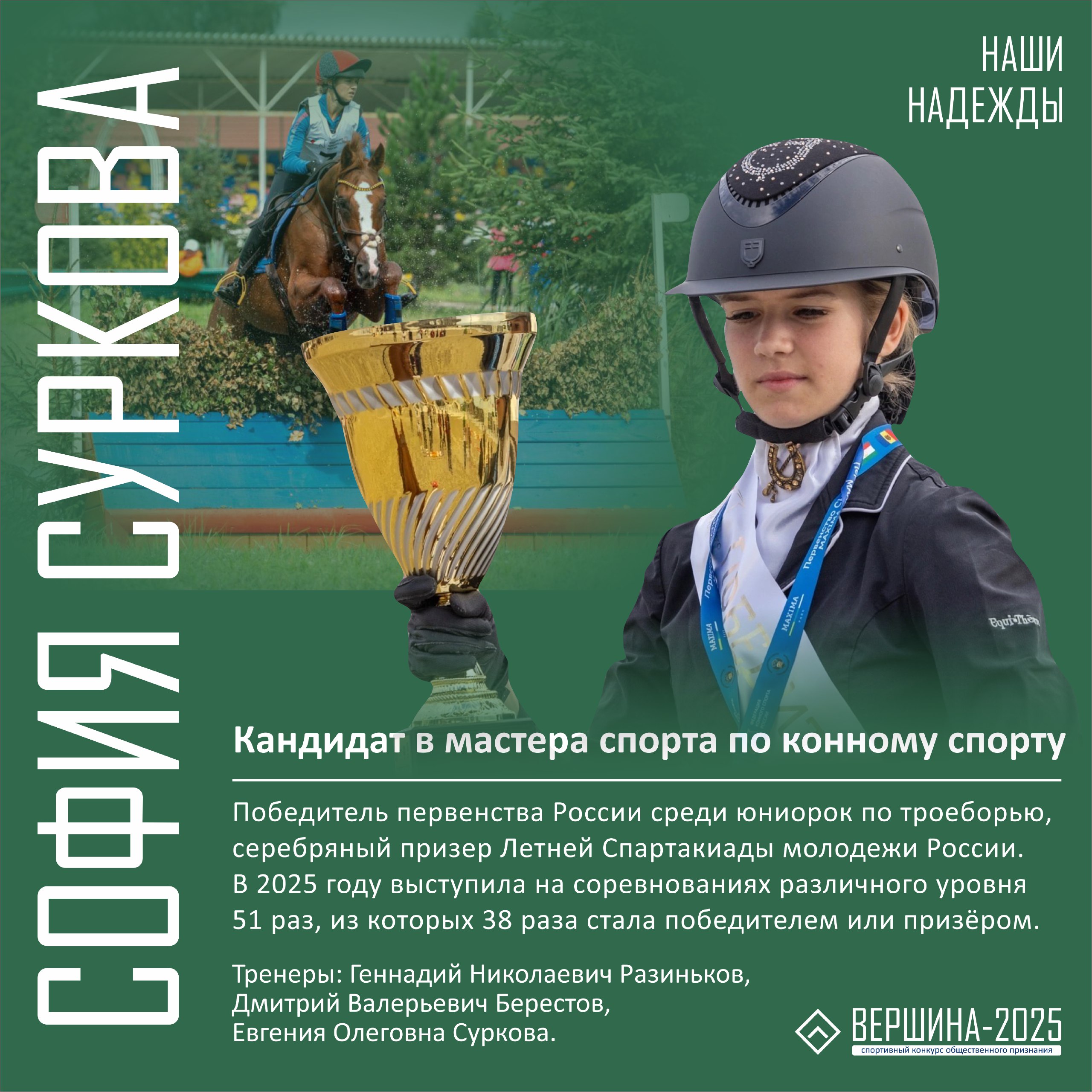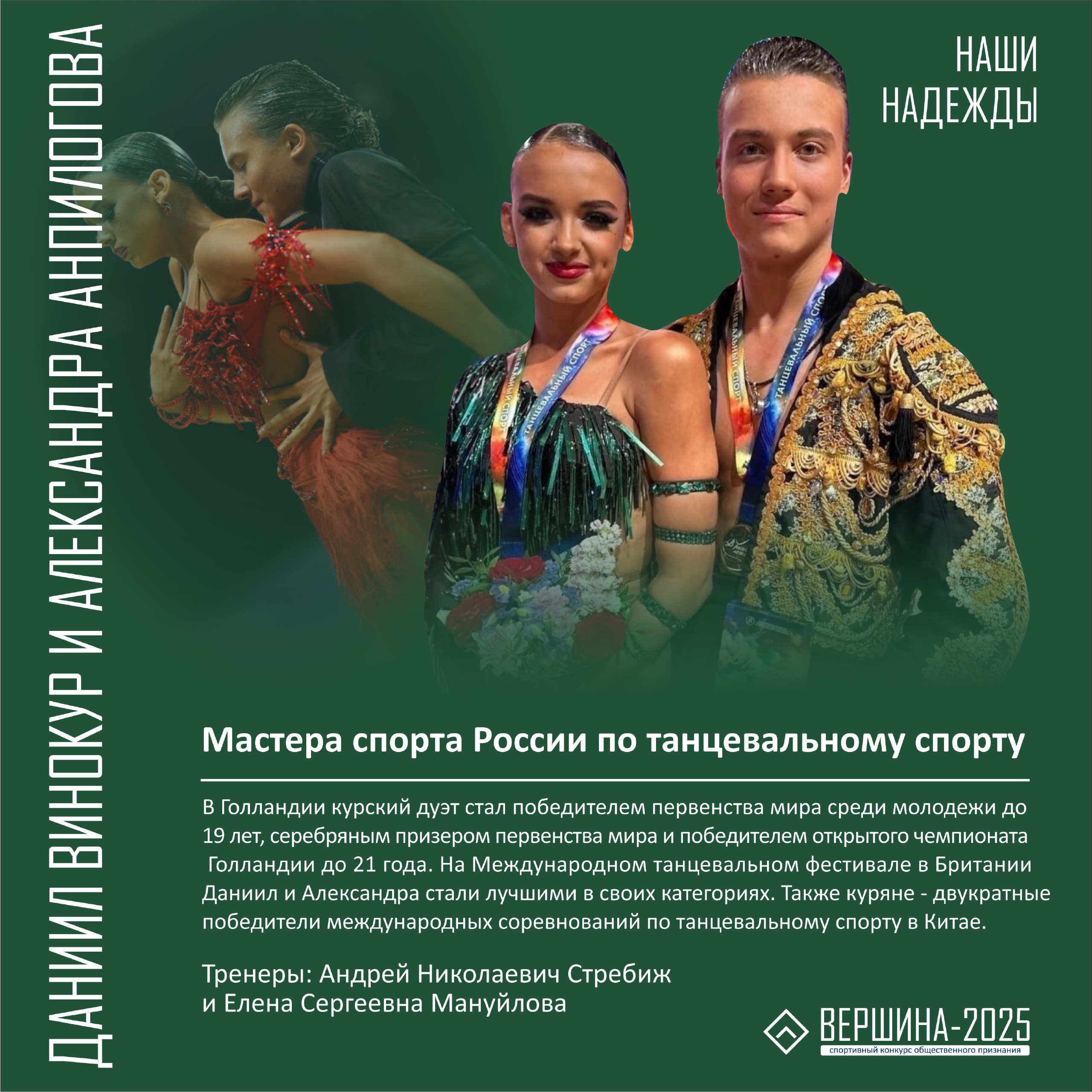 Рассказываем о сильнейших молодых курских спортсменах, которые были отмечены наградами областной премии общественного признания "Вершина". В этом году в списке лучших 15 чемпионов по 10 видам спорта: фехтованию, боксу, тяжелой атлетике, всестилевому каратэ, легкой атлетике, шахматам, дзюдо, конному спорту, баскетболу и танцевальному спорту.